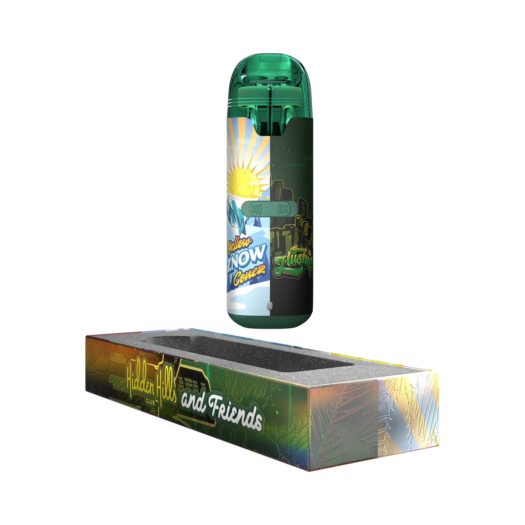 Introducing the Hidden Hills Friends Dual Device – your ultimate ticket to flavor paradise! With its sleek design and innovative features, this 2-in-1 disposable device is a game-changer for any hemp enthusiast. Each device comes loaded with dual flavors, giving you the freedom to switch it up whenever the mood strikes. Whether you’re in the mood for something fruity and uplifting or a more mellow, relaxing experience, we’ve got you covered. With 1g of each flavor and a total of 2g per device, and thanks to its USB-C rechargeable design, you can power up on the go and never miss a beat. Plus, with (2) 1ml tanks and a switch mechanism, switching between flavors has never been easier. But that’s not all – this Dual Device also features a pre-heat function for smooth, consistent hits every time. And with a special blend of THC compounds including THC-A, THC-P, and THC-M, you can expect a truly elevated experience that hits all the right notes. Each dual device is equipped with USB-C rechargeability, ensuring you’re always ready for your next session. Plus, with the pre-heat function, enjoy a smooth, consistent experience every time. Seamlessly transition between flavors with our switch mechanism. No need to carry multiple devices—simply toggle between Peach Funfetti and Pink Berry Kush or Yellow Znow Conez and Green Slushie for a customized experience.Hidden Hills and Friends Dual Device Strains